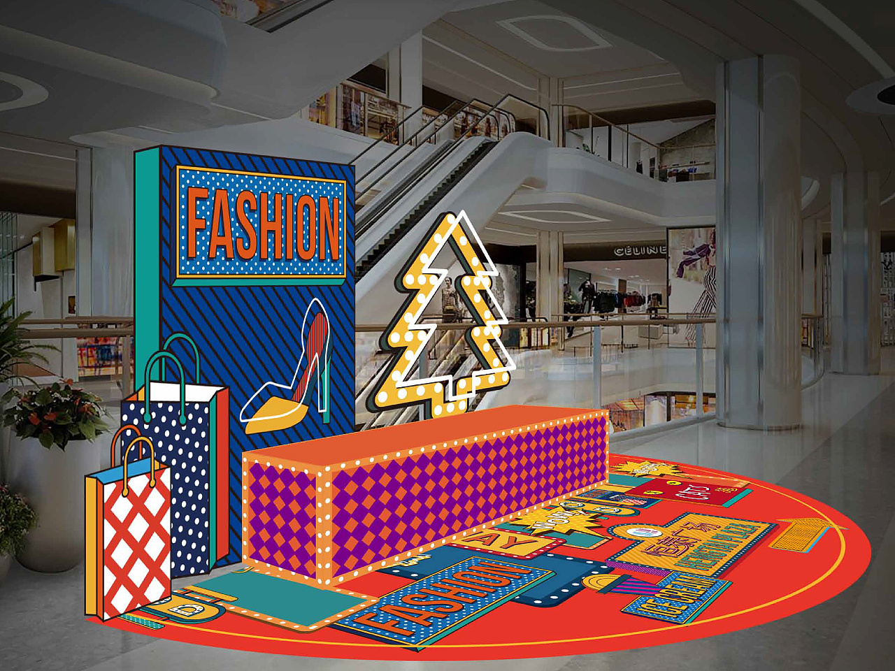 之前也有講到,區位、環境、建筑、業態是項目開業推廣的述求點。而該項目內部裝修環境以淺色為主,色彩較單一,需增添活力,因此需要 繽紛多彩 的視覺,烘托節日氣氛!