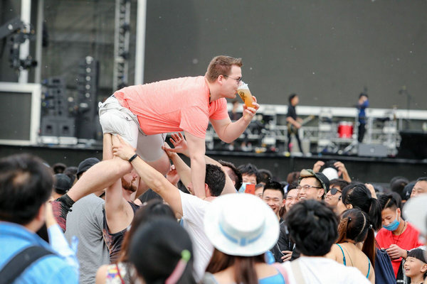 一位男觀眾被同伴高高舉起,隨著音樂暢飲。