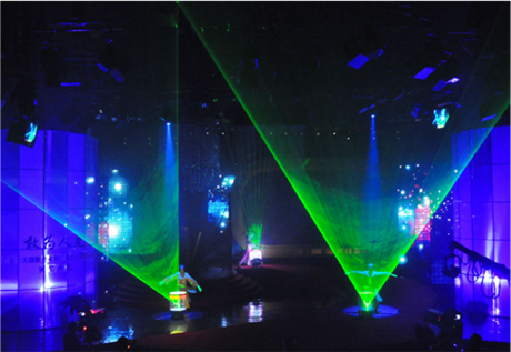 開場前可以用作激光秀,激光圖案布滿整個場館,加是勁暴音樂,非常振撼,不時打出公司LOGO或公司名稱,祝福語等,同時達到了商家娛樂營銷的目的,更能表現客戶訴求.表演中激光隨著鼓點或音樂節奏輕、重、快、慢,變出不同的圖案,隨著節奏跳動,鼓聲停時鼓面上可以出現公司LOGO或公司名稱,祝福語等...,表演中段演員神奇地拿起鼓上的激光柱不停舞動,神奇的"激光舞"帶你進入奇妙的光幻世界.豉面上有激光射出加上水的折射在會場上出現非常炫麗的圖案.此鼓還可以做為整場晚會的激光背景用.